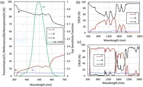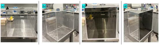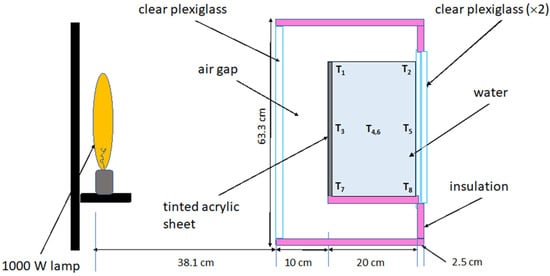 The front surface of the Trombe wall prototype was made from a 3 mm thick clear acrylic sheet that was tightly fitted in the insulation board frame and then sealed using silicon sealant at its edges. These seals were subsequently covered with sheathing tape. The reflectance (R) and transmittance (T) of this clear acrylic sheet was measured over the wavelength range extending from 300 nm to 1400 nm using a UV-VIS spectrophotometer (Shimadzu 2600i). The reflectance and transmittance of the clear acrylic sheet over the wavelength range from 1400 nm to 23 μm was measured using an FTIR spectrometer (VERTEX 70). The absorptance (A) of the clear acrylic sheet was determined using the reflectance and transmittance measurements and the equation A + R + T = 1. A 3 mm thick acrylic plexiglass sheet of dimensions 35 cm × 35 cm was integrated into the back side insulation of the prototype. This allowed light to pass through the Trombe wall prototype, as a desired feature of the water Trombe wall in this work was transparency or semi-transparency. The side of the Trombe wall prototype was designed as an insulated door to allow users to change the TES medium and adjust the position of the thermocouples. A 1000 W Hortilux Blue W Metal Halide bulb mounted vertically with a white reflector behind it was used to simulate solar radiation. This light source was 38 cm away from the front surface of the acrylic sheet. The Trombe wall consisted of a TES medium as water and the water was stored in a clear acrylic plexiglass container. The dimensions of the water container were 30 × 20 × 20 cm. Some experiments were run with a 5 mm thick tinted acrylic sheet (manufactured by Chemcast) integrated into the TES medium at the front of the water container. Similar to the clear acrylic sheet at the front of the Trombe wall prototype, the reflectance, transmittance and absorbance of the tinted acrylic sheet were determined using UV-VIS and FTIR measurements. The plexiglass container, with and without the tinted acrylic sheet, is shown in