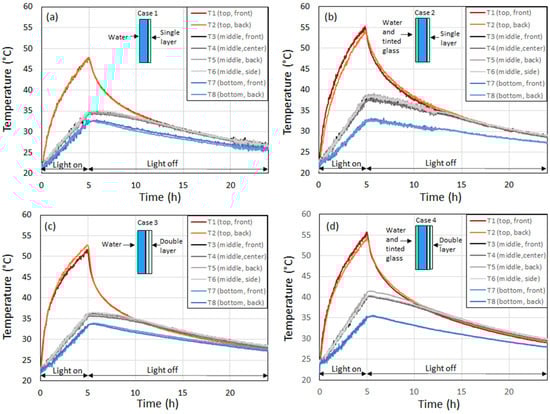 Figure 4, the difference between the temperatures at the top and bottom of the water storage medium could be greater than 20 °C at the end of the charging period (e.g., for Cases 2 and 4). The capability of the water Trombe wall to move stored thermal energy to the top of the wall in the form of heated water allows for increased functionality that cannot be achieved using traditional Trombe wall materials. That is, the heated water at the top of the Trombe wall can be used for applications other than space heating, especially during the summer months. For example, it has been observed that dishwashers operate at temperatures as low as 38 °C, and comfortable temperatures for showering are between 37–40 °C. Furthermore, the recommended temperature in new washing machines for high efficiency is about 49 °C. Moreover, it is preferrable to store building water in hot water heaters at 60 °C or higher to minimize bacteria, although the water temperature at fixture outlets should be a maximum of 49 °C to prevent scalding injuries. Considering the inlet water temperature to building water tanks is typically less than 20 °C in the summer (and the temperature at the top of the Trombe wall prototype reached ~55 °C for the experiments reported in this work) the inlet water could be preheated in a water-based Trombe wall to help reduce water heating costs and energy consumption in buildings.