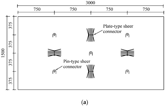 Four PCCISPs were designed in this research, and the static-loading tests were carried out on them. The length and width of the four test panels were the same, with a length of 3000 mm, a span of 2800 mm, a width of 1500 mm and a thickness of 280 mm and 310 mm. The outer concrete wythe was decorated with single-layer bi-directional steel bars, and the inner concrete wythe was decorated with double-layer bi-directional steel bars. The longitudinal and transverse steel bars were both HRB400, with a diameter of 10 mm and a spacing of 200 mm (see Figure 3). The basic parameters of test panels (SP-1~SP-4) are shown in Table 1. Stainless steel shear connectors were used to connect the two concrete wythes of the PCCISPs with the rigid foam polyurethane insulation board of the sandwich layer. The stainless steel shear connectors were arranged in a combination of plate-type shear connectors and pin-type shear connectors. The plate-type shear connectors were symmetrical and the pin-type shear connectors were evenly arranged in the panel (see Figure 4).