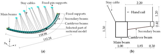 Diagram of curved beam unilateral stayed bridge (Unit: m). (a) Overall diagram of glass landscape bridge, (b) Bridge cross-section.