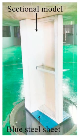 According to the Chinese load code (JGJ/T 338-2014) [], the geometric scale of the sectional model was determined as 1:10 based on the dimensions of the wind tunnel laboratory and case bridge in Section 2.1, and the sectional model was fabricated using aluminum according to the geometric scale. The sectional model is shown in Figure 2, and a blue steel sheet was used for the connection of the three-component force/torque sensor and the sectional model in the aerostatic force testing.