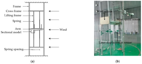 The same sectional model was used for sectional model vibration tests and aerostatic force tests. The sectional model vibration test must meet the similarity requirements of geometric, elastic, and inertia parameters, and the section model had only vertical and torsional degrees of freedom. The sectional model was suspended by eight springs for vibration testing (Figure 3), which is referred to as the vibration test system in the following. Spring stiffness and spring spacing controlled the vertical and torsion frequencies (Figure 3a), respectively. The windscreen at both ends of the model was used to simulate two-dimensional (2D) flow in the sectional model (Figure 3b); the wind speed sensor was placed at the same height as the sectional models, and laser displacement sensors were installed under the sectional model.