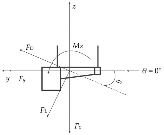 Both Fy and Fz are obtained in the sensor coordinate system; because the sensor coordinate system coincides with the sectional model coordinate system, the aerodynamic force in the sectional model coordinate system is equal to the force measured by the sensor. There is no trigonometric relationship between Mz and θ. Fy and Fz can be converted to FD and FL, respectively, using the following formulas: