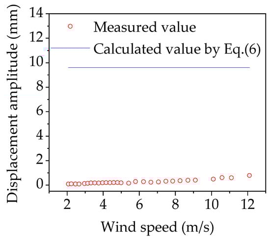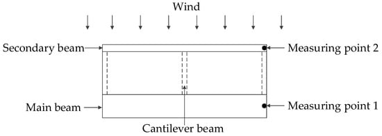 Usually, a sectional model vibration test is used to verify vortex vibration stability. In this sectional model vibration test, 29 wind speed cases were determined, and the minimum and maximum wind speed cases were 2.07 and 12.10 m/s, respectively. The scope of the Reynolds numbers was 0.97 × 105 and 5.66 × 105 in the test cases. A uniform flow field with θ = 0° was simulated in a wind tunnel for the sectional model vibration test. Measurement point 1 was defined (Figure 6), which was used to measure vertical displacements.