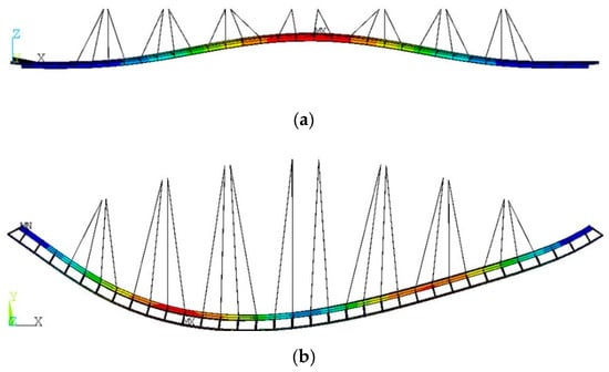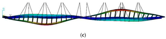 Figure 1a shows that the CBUSB finite element model was established using ANSYS software [], where beam188 element, link10 element, and mass21 elements were used to establish the curved beam model, stayed cable model, and handrail and bridge deck model, respectively. The Beam188 element is a two-node three-dimensional (3D) linear beam element based on the Timoshenko theory []. Link 10 is a tension-only or pressure-only element based on finite displacement theory []. The Mass21 element is a particle without shape and only has the function of stimulating quality. Note that the mass21 element was uniformly distributed in the main beam and secondary beam models to simulate the mass distribution of the railing and bridge deck, and the contribution of the handrail to the windshielding area was considered in the total windshielding area of CBUSB. The natural frequencies and modal shapes obtained through dynamic analysis are shown in Figure 8, where the first-order vertical and torsional models were symmetric and antisymmetric shapes, respectively. The difference in the fundamental frequencies between the first-order vertical and transverse bending models was small. Therefore, the modal coupling between first-order vertical and first-order transverse bending was dynamically intrinsic. The first-order torsional mode had an antisymmetric shape, and the frequency difference between the first-order vertical bending mode and the first-order vertical bending mode was large, so the possibility of bending torsional coupling was small.