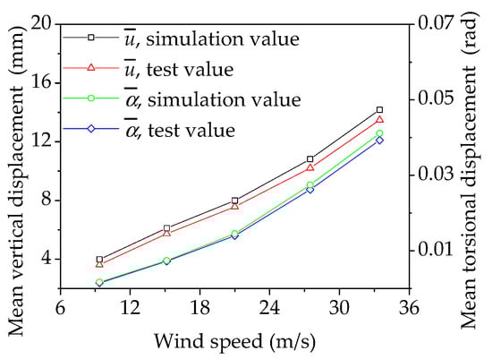 Based on the quasi-steady assumption and the results of aerodynamic force tests, the mean lift force and the mean torque were applied to the finite element model (Figure 1a), and then the mean vertical displacement, , and the mean torsional displacement, , at the midspan of the finite element model were calculated. The mean displacement responses of measuring point 1 in Section 2.4 were converted using the geometric scale 1:10. By comparing the mean vertical displacement responses and the mean torsional displacement responses, the difference between the sectional model vibration test and finite element simulation was small (Figure 9). Therefore, the static wind load characteristics of the finite element model were well simulated.
