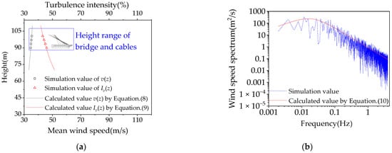 The simulated turbulent wind field was then verified to ensure the accuracy of turbulent wind loads imposed on the finite element model. According to the Chinese load code [], the mean wind speed profile function is written as follows: