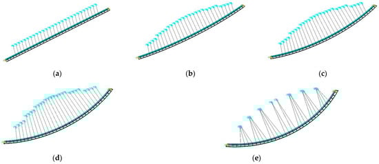 The curvature of the finite element model in Figure 1a calculated using Equation (12) was 0.0097, which is defined as curvature case 5. Then, the definitions of curvature cases 1–4 are shown in Figure 11, and the corresponding curvatures were 0.0000, 0.0024, 0.0048, and 0.0072, respectively. During the curvature adjustment, the cross-section of the bridge and the fixed supports at both ends remained stationary; the connection point between stay cables and bridges remained stationary; and the z-axis coordinate values of each stay cable fixed-pin support remained stationary. Wind loads were applied to finite element model nodes under each curvature case, then the finite element model was analyzed transiently.