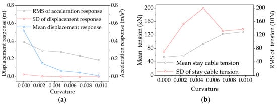 Figure 12 shows the trend of wind-induced response with curvature, and standard deviation abbreviated (SD). CBUSB was dominated by mean wind loads under wind loads (Figure 12a); with curvature increases, the mean displacement response and the SD of the displacement response decreased, indicating that the total wind-induced vibration response was suppressed. As the curvature increased, the RMS of the acceleration response decreased, and peak acceleration also decreased, indicating that increasing the curvature is conducive to improving pedestrian comfort of CBUSB. As the curvature increased, mean stay cable tension also increased (Figure 12b); SD of stay cable tension initially increased, then decreased, then increased, and the maximum RMS was found in curvature case 3.