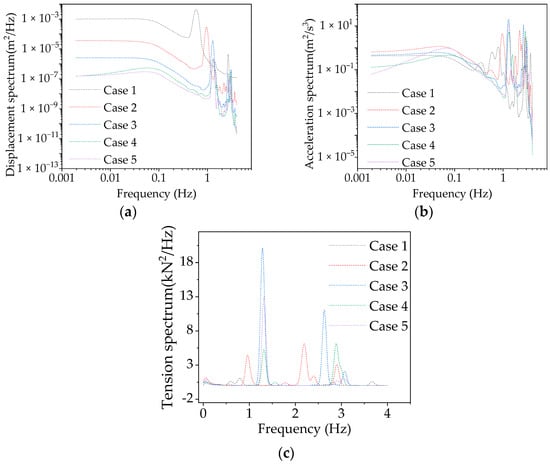 Figure 13 shows the spectrum analysis of bridge and stayed cable. The first-order frequencies of case 1–5 were 0.586, 0.957, 1.283, 1.308, and 1.318 Hz (Figure 13a). As the curvature increased, the first-order frequency of CBUSB also increased, demonstrating that the excitation frequency of resonance the response was far away from the wind predominant frequency (0.006–0.037 Hz), and the resonance energy excited by wind load decreased at a certain wind speed. As the curvature increased, the high-order modal resonance response was excited, and the bandwidth of high-order modal resonance frequency gradually increased, but the peak value of the high-order mode was smaller than the low-order modal, so the high-frequency vibration reduction should be considered for pedestrian comfort control at high wind speed, and a broadband vibration reduction method can be used. As the curvature increased, the resonance acceleration energy distribution gradually changed from sparse to dense in the range of 1–4 Hz bandwidth (Figure 13b), resulting in a modal coupling vibration. The peak values of cable tension resonance energy in case 3 was high (Figure 13c), and after band-pass filter [], the resonance response of case 3 accounted for 43.11% of the fluctuating response. Due to the long-term dynamic response, the cable was in fatigue loss and may have had fracture failure. Therefore, further study is necessary.