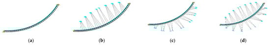 A curved beam bridge was set with four cable layout cases, which were no cable layout in Figure 14a, cables arranged near the center of the curvature (as same as the CBUSB example) in Figure 14b, cables arranged away from the center of the curvature in Figure 14c, and cables arranged on both sides of the bridge in Figure 14d. Symmetries of the cables in case 2 and 3 were arranged with respect to the tangent of the connection point. The cable layout of case 4 was a combination of cases 2 and 3. The finite element model of each case was analyzed, and the dimensionless data were analyzed by dividing the time domain calculation results of each case by the calculation results of case 2.