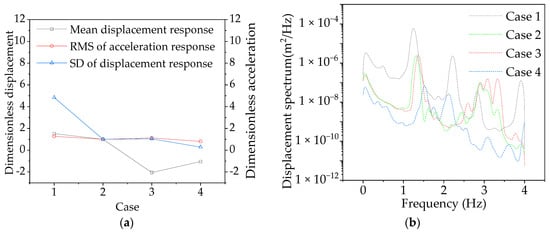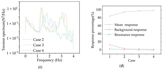 The y-direction bridge displacement response and cable tension response at the midspan of cases 1–4 were extracted, and the response components were obtained by band-pass filtering. Figure 15 shows the effect of a change in the cable layout scheme on various parameters. The along-wind mean displacement response of cases 3 and 4 was 2.05 and 0.95 times that of case 2, respectively (Figure 15a) because the arrangement of cables outside the center of the curvature may reduce the horizontal stiffness in the y-direction and increase the displacement response. The acceleration RMS of cases 1, 3, and 4 were 1.27, 1.26, and 0.81 times that of case 2, respectively. Cables arranged near the center of the curvature and on both sides of the bridge can reduce the peak acceleration in the y-direction of the bridge, allowing pedestrian comfort control. The natural frequency of the CBUSU can be increased by arranging cables (Figure 15b), and the resonance energy distribution of case 4 was more dense than that of case 1, and that of case 1 was more dense than that of case 2 and 3, which indicates that the possibility of modal coupling vibration will be reduced by arranging cables on one side, and the possibility of modal coupling vibration will be increased by arranging cables on both sides. As shown in Figure 15c, the frequency of the cable in cases 2, 3, and 4 and the frequency of the bridge in Figure 15b increased at 1.25 Hz, 1.32 Hz, and 1.52 Hz, respectively. The result shows that after the bridge cable interaction, the bridge and the cable resonated at the same frequency, that is, the nonlinear vibration of the cable included the response of the bridge, and the vibration of the bridge also included the response of the cable. As shown in Figure 15d, by comparing the proportion of each response component in the total response, CBUSB was dominated by the mean displacement response, the fluctuating response of cases 1 and 2 was dominated by the background response, and the fluctuating response of cases 3 and 4 was dominated by the resonance response. Therefore, the arrangement of cables away from the center of curvature can significantly increase the proportion of resonance response and increase the possibility of resonance failure of the bridge at high wind speed. Therefore, when CBUSB arranges the cable, it should be arranged inside the curvature center as far as possible to reduce the possibility of resonance damage.