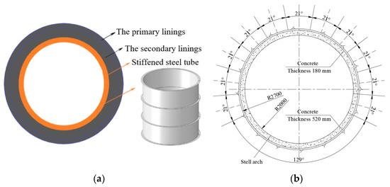 In recent years, a new type of composite lining structure has been adopted in the construction of long-distance water conveyance tunnels: steel tube and primary linings are combined, and self-compacting high-performance concrete is filled between the linings to form a three-layer tunnel lining system of “shield primary lining-self-compacting concrete-steel tube lining”, as shown in Figure 1a. In this paper, the tunnel lining system consists of the primary lining, which comprises 0.18 m thick shotcrete, surrounding rock bolts, and a steel arch. The inner lining has a 0.024 m thick stiffened steel tube with a stiffening rib height of 0.012 m and a spacing of 1.2 m on the surface of the steel tube. The steel tube and the primary lining are backfilled with self-compacting concrete (thickness 0.52 m), as shown in Figure 1b. The tunnel has a circular cross section with an internal diameter of 4.0 m and a working pressure of 0.9 MPa. The outer concrete lining in the composite lining structure not only bears the external surrounding rock pressure but also shares the burden of the internal water pressure with the steel tube. The internal water pressure reduces the damage to the outer concrete because of the tension it generates. The constraints of the external surrounding rock, concrete lining, and stiffening rib on the steel tube surface are beneficial to the enhancement of the lateral stiffness and the prevention of local buckling and instability of the thin-walled steel tube.