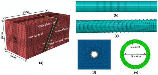 A 3D numerical model of the water conveyance tunnel subjected to reverse fault conditions was established by ABAQUS general finite element software. When the ratio of the cross-section size to the tunnel section size is between 4 and 10, the boundary effect can be eliminated [33]. The overall dimensions of the numerical model were 200 m × 100 m × 100 m. In this paper, the tunnel axis was orthogonal to the fault, and the fault plane was set in the middle of the fault fracture zone, dividing the model into two parts: a moving block and a fixed block. Figure 2 shows a typical three-dimensional model, with a buried depth of 50 m, fault fracture zone width of 10 m, and fault dip angle of β = 60° for illustration purposes. The four-node reduced integral shell element (S4R) was employed for modeling the stiffened steel tube, and the surrounding rock, fault fracture zone, and concrete were simulated by eight-node reduced integral “brick” elements (C3D8R). To ensure the calculation efficiency and accuracy, much finer meshes were applied to the parts of the model close to the fault fracture zone and tunnel excavation area; the mesh sizes in the longitudinal direction of the tunnel were 0.6 m and 0.7 m, and the dimensions of the concrete and stiffened steel tube were 0.8 m and 0.4 m, respectively [33]. The whole model had approximately 200,000 elements.