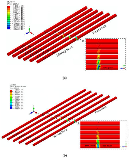 Axial strain nephogram under different fault displacements (β = 60°; Stiff): (a) Concrete lining and (b) steel tube lining.