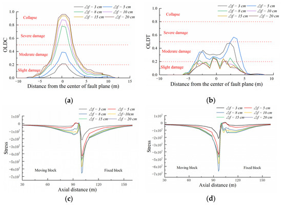 Figure 14 shows the overall axial damage distribution curve of concrete with different surrounding rock properties in the fault fracture zone. Different surrounding rock stiffnesses in the fault fracture zone will affect the damage characteristics of composite lining structures. The axial OLDC degree of the concrete lining increases with the increasing stiffness of the surrounding rock in the fracture zone, but the axial influence range is negatively correlated with the stiffness of the surrounding rock in the fracture zone. In contrast, for the axial OLDT, the tensile damage degree of the concrete lining structure increases with the decrease in the stiffness of the surrounding rock in the fracture zone. This finding shows that under reverse fault conditions, the softer the surrounding rock of the fault fracture zone is, the greater the deformation capacity of the composite lining structure; thus, the hoop tensile deformation of the composite lining structure increases. When △f = 8 cm, moderate damage occurs in the range of 4 m to the two blocks from the center of the fault plane; the influence range of the soft surrounding rock in the axial direction is wider than that of the hard surrounding rock on the side of the fixed block. Figure 13 shows that the softer the fault plane of the surrounding rock in the fault fracture zone is, the greater the tensile strain in the local area of the moving block vault and the fixed block invert.