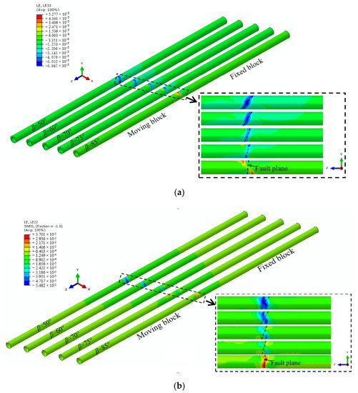 Axial strain nephogram at different dip angles of faults (Δf =8 cm and stiff): (a) Concrete lining and (b) steel tube lining.