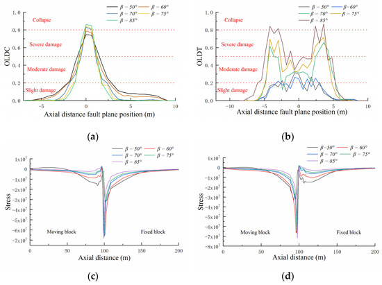 Figure 10 shows the overall axial damage distribution curve of the concrete lining under different β values. It can be seen from the figure that the axial influence range of the concrete lining OLDC is negatively correlated with β, and the damage degree at the fault plane increases monotonically with the increase in β. When β < 60°, the axial compressive strain of the composite lining structure is obvious, which reduces the tensile damage of the concrete lining, achieving only moderate damage in the local fault plane area. When β > 60°, the axial OLDC gradually concentrates on the fault plane. At the same time, OLDT occurs near the fault plane of the two blocks, which is concentrated in the area approximately 3 m away from the fault plane. The axial damage range and damage degree tend to increase with increasing β because under reverse fault conditions, different structural layers lead to the local detachment of the moving block crown and the fixed block invert near the fault plane due to material and bonding property differences. Furthermore, stress concentration occurs at the critical part of axial detachment and combination, resulting in large tensile stress and failure. This finding shows that when the water conveyance tunnel passes through the fault fracture zone, increasing β will lead to the concrete lining being damaged by the tension, compression, and shear stresses.