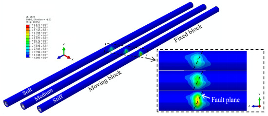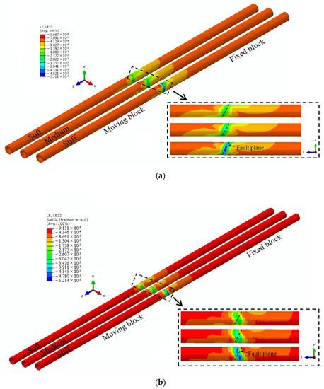 In the process of numerical analysis, the first three steps constrain the normal displacement of the side of the model (X and Y), the bottom is constrained by the fixed end, and the top surface is set to the free surface, as shown in Figure 2a. When applying the fault dislocation displacement load, release the Y and Z constraints of the moving block, and based on the distributed loading increment method, the 20 cm fault movement is divided into several smaller quantities and applied to the Y and Z directions of the moving block to eliminate the influence of dynamic effects. The constraint condition of the fixed block remains unchanged.