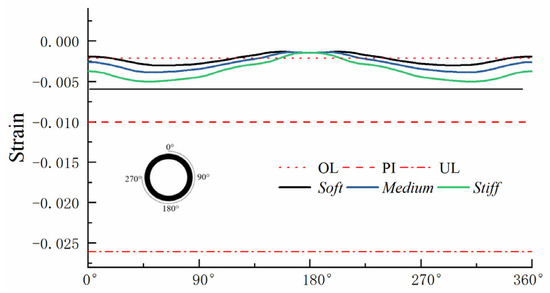 Figure 15 shows the axial strain distribution curve of the peak strain section of the steel tube with different surrounding rock properties in the fault fracture zone. It can be seen from the figure that under reverse fault conditions, the variation trend of the steel tube lining axial strain does not change with the change in the surrounding rock stiffness in the fault fracture zone; additionally, the composite lining structure near the fault plane is mainly subjected to compressive strain in the ring upward direction. With the increase in the stiffness of the surrounding rock in the fault fracture zone, the axial strain of the steel tube increases obviously, and the peak strain appears at the spandrel. This finding shows that with the increase in the surrounding rock stiffness in the fault fracture zone, the composite lining structure is strongly restrained by the outer surrounding rock, leading to the dislocation failure of the tunnel lining due to compression and shearing at the fault plane. Although the outer concrete lining will produce tensile failure in the form of severe cracks in the soft surrounding rock in the fracture zone, due to the existence of the inner steel tube, the use function of the water conveyance tunnel is not affected by the concrete lining. In contrast, when the composite lining passes through the weak zone with poor surrounding rock properties, it can withstand greater fault dislocation displacement.