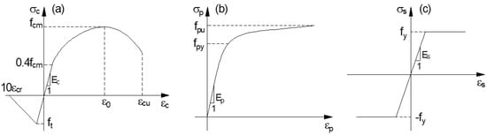 The stress-strain responses of concrete, prestressing and nonprestressed steels are respectively shown in Figure 1a–c, in which σ and ε represent stress and strain, respectively; subscripts c, p and s are concrete, prestressing steel and nonprestressed steel, respectively; E is the elastic modulus; ε0, εcu and εck are concrete compressive strain at peak stress, ultimate compressive strain and cracking strain, respectively; fcm and ft are concrete mean compressive strength and tensile strength, respectively; fpy and fpu are prestressing steel yield stress and tensile strength, respectively; and fy is the nonprestressed steel yield strength. According to EC2 [], fcm = fck + 8, where fck is the concrete characteristic cylinder compressive strength. As shown in Figure 1a, the concrete under compression exhibits elastic behavior until 0.4fcm, followed by nonlinear stress-strain behavior recommended by EC2 []. The tensile concrete also exhibits elastic behavior until its tensile strength, followed by linear tension-stiffening. The strain at the end of tension-stiffening is 10εcr, where εcr = ft/Ec. The stress-strain curve suggested in [] is applied for prestressing steel, as shown in Figure 1b. Nonprestressed steel is elastic and perfectly plastic, as shown in Figure 1c.