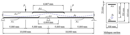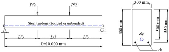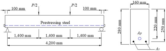 Simply supported PC beams with horizontal steel tendons (see Figure 5) are applied for the first-phase study. Third-point loads are applied. The investigated variables are the bond condition (bonded or unbonded) and initial prestress level σp0/fpu (ratio of initial prestress to tendon tensile strength). The material parameters are as follows: Ap = 900 mm2, fpu = 1840 MPa, fpy = 1564 MPa, Ep = 200 GPa, As = 720 mm2, fy = 450 MPa, Es = 200 GPa, fck = 60 MPa, Ec = 39 GPa, ft = 4.4 MPa, εcu = 0.003. In the analysis, the weight of the beams is converted into uniform load.
