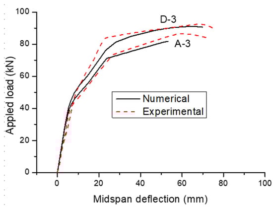 Comparison between experimentally and numerically obtained load-deflection curves.