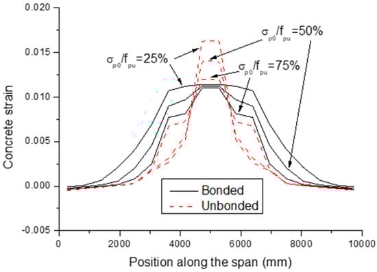 Figure 6 shows the distribution of concrete tensile strains in failure in PC beams with different bond conditions and prestress levels. All failures are caused by concrete crushing at midspan. While concrete cracking is closely related to its tensile strain, the crack pattern can be deduced from the graph of Figure 6.