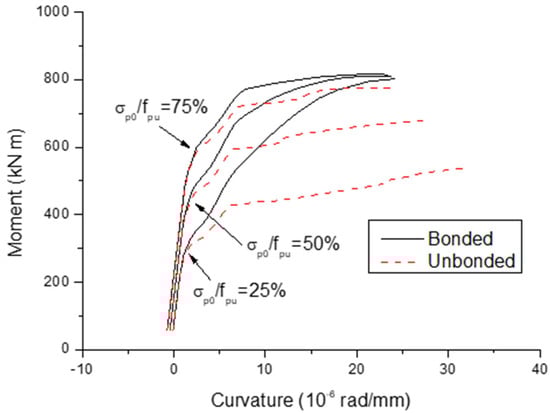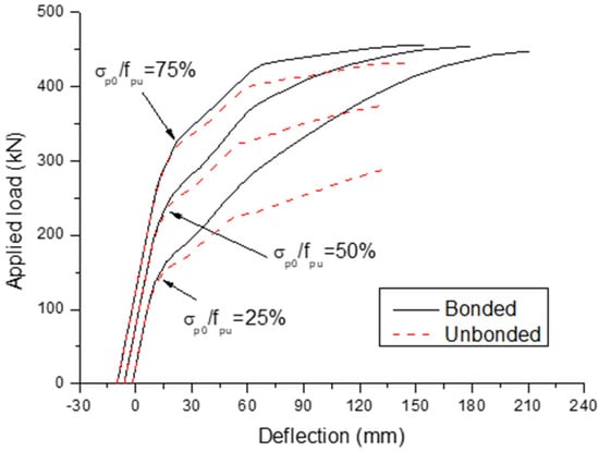 Both bonded and unbonded prestressing techniques are commonly used in practice. In bonded prestressed concrete (BPC) beams, the strain in tendons is compatible with the surrounding concrete, and thus the tendon stress is section-dependent. However, in unbonded prestressed concrete (UPC) beams, the tendons are free to move along the duct, and so there is no strain compatibility between the tendon and surrounding concrete. Friction losses in unbonded tendons are practically small, and the tendon strain is uniformly distributed along the tendon length. Therefore, the stresses in unbonded tendons are member-dependent. The difference in tendon stress evolutions results in marked performance discrepancy between BPC and UPC beams. For example, if tendons are made of fiber reinforced polymer (FRP), bonded tendons may be ruptured prior to concrete crushing while the use of unbonded technique can effectively alleviate the rupture failure []. Although numerous theoretical and experimental studies on BPC [,,,,] and UPC beams [,,,,] are available, little work has addressed the bond effect of steel tendons in PC beams []. Hussien et al. [] conducted an experiment regarding simply supported BPC and UPC beams made of different concrete grades. Their work showed that BPC beams exhibited much better structural performance than UPC beams in terms of the ductility, stiffness and deflection.