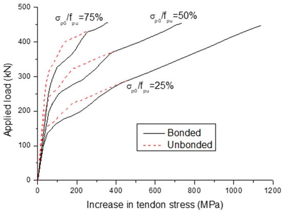 The prestress level is crucial in design of PC structures []. It is well known that the ultimate load of BPC beams is almost independent of the prestress level as bonded tendons usually have yielded before failure of the structure. By contrast, unbonded tendons generally have not yielded in failure [] and, therefore, the ultimate load of UPC beams heavily depends on the prestress level. Consequently, the impact of prestress level on moment redistribution of BPC continuous beams may be different from that of UPC ones. Therefore, it is essential to identify the effect of prestress level in BPC and UPC beams.