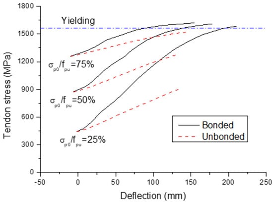 At failure, unbonded tendon stress is below the yielding stress of 1564 MPa, even at a high prestress level of 75%. As a result, the tendons can be considered to be in their elastic range, which is evidenced by an approximately linear stress-deflection relationship as shown in Figure 10. In contrast, bonded tendons have yielded at ultimate, even at the prestress level of 25%. As a consequence, the stress-deflection behavior exhibits marked nonlinearity when approaching the yielding point. At the ultimate limit state, increasing prestress levels produce higher ultimate stresses in unbonded tendons, while the prestress level has negligible impacts on ultimate stresses in bonded tendons. For a given prestress level, stresses develop substantially quicker in bonded tendons than that in unbonded tendons when deflecting.