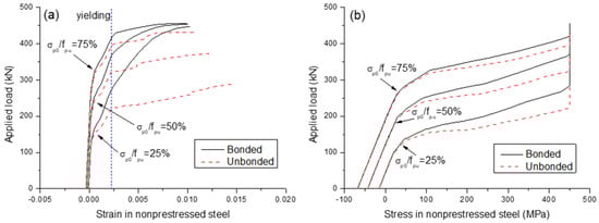 Figure 11 presents strain and stress development in nonprestressed steel. The strain development in the beams, except for BPC scenarios having the 25% prestress level, experiences three stages. The transitions are caused by cracking and yielding. The yielding stage is not apparent when bonded tendons with a low prestress level are used. After cracking, the nonprestressed steel strain or stress in UPC beams develops quicker than that that in BPC beams. This can be explained by the fact that at a given post-cracking moment, unbonded tendons develop a lower stress, and hence a larger nonprestressed steel stress is required for section equilibrium, when compared to bonded tendons. According to the material law, once the nonprestressed steel reaches its yield strain of 0.00225, the stress remains constant up to the ultimate. For UPC beams, increasing prestress levels produces smaller ultimate strains in nonprestressed steel, indicating a lower ductility. By contrast, the ultimate nonprestressed steel strains in BPC beams with different prestress levels are almost identical.