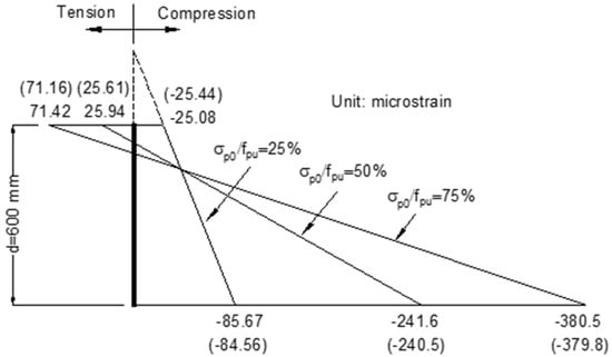 Before introducing the applied load, the whole section is in compression at a 25% prestress level. The concrete strain is around −85 με at the bottom fiber and −25 με at the top fiber, suggesting that the initial neutral axis locates above the top fiber (see Figure 12). At 50% and 75% prestress levels, the bottom fiber is in compression while the top fiber in tension, suggesting that the initial neutral axis lies within the cross section (see Figure 12).