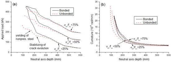 Figure 13a,b illustrate the neutral axis evolutions in the midspan section with the load and curvature, respectively. The neutral axis in UPC beams deviates from that in BPC beams after cracking. The load versus neutral axis depth curves are markedly influenced by the stabilization of crack evolution and the yielding of nonprestressed steel, as illustrated in Figure 13a. At failure, unbonded tendons produce smaller neutral axis depths than bond tendons. Their difference tends to be less notable with the increase of prestress level. Greater prestress levels correspond to higher neutral axis depths in UPC beams, while the effect of prestress level in BPC beams is insignificant.