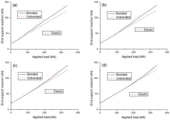 Load-reaction curves depending on the prestress level. (a) σp0/fpu = 0; (b) σp0/fpu = 25%; (c) σp0/fpu = 50%; (d) σp0/fpu = 75%.