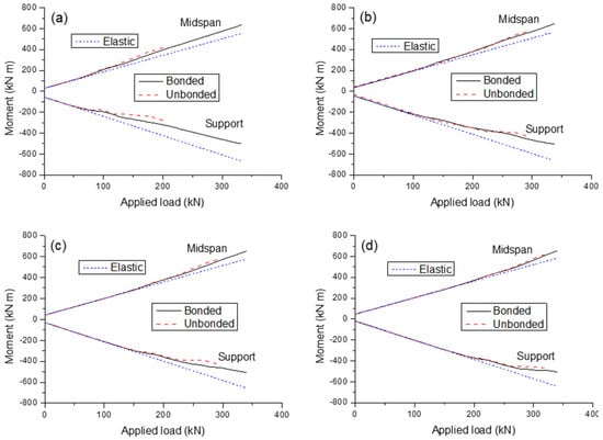 Figure 16 shows the load-moment relationship for BPC and UPC beams with different prestress levels. Different from the elastic moment with a fixed growth rate, the growth of actual moments is impacted by several phases, e.g., the onset of cracking and the formation of plastic hinges. When first cracks appear in center support, its flexural stiffness substantially decreases. Consequently, the moment in the center support is redistributed toward the midspan, leading to a reduction in the growth rate in the center support moment while an increase in the growth rate in the midspan moment. Similar redistribution behavior is observed on the formation of first plastic hinges. For a given post-cracking load, unbonded tendons commonly lead to higher difference between the actual and elastic moments.