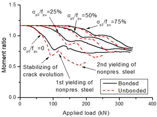Figure 17 demonstrates the evolution of the ratio of the center support moment to the midspan moment (secondary moment and self-weight moment are excluded) in BPC and UPC beams with different prestress levels. Prior to cracking, the moment ratio remains a constant value of 1.17, indicating no redistribution of moments. Beyond cracking, the moment ratio tends to gradually decrease, while the decrease for UPC beams is faster than that for BPC beams. This can be explained by the fact that moments tend to be redistributed away from the center support and that unbonded tendons results in higher moment redistribution than bonded tendons. In addition, the load versus moment ratios curves are typically influenced by several phases including the stabilization of crack evolution, the first yielding and second yielding of nonprestressed steel, as illustrated in Figure 17. This is attributed to that these phases cause marked change in relative stiffness between the midspan and center support sections, which is recognized as the most important factor impacting moment redistribution [,].