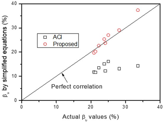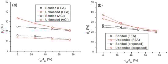 Variation of βu with varying prestress level. (a) comparison of ACI equation with FEA; (b) comparison of proposed equation with FEA.