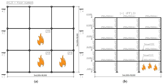 Dependency of building’s seismic response on the points of fire outbreak is exemplified by the spatial three-span five-storied frame (Figure 1). The frame on the plane is formed by the columns’ unit 6 × 6 m. The floor height is 3 m.