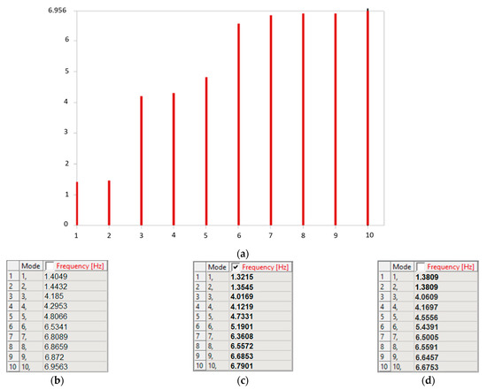 (a) Histogram of proper frequencies for frame FNF. The values of the proper frequencies for the frames (b) FNF, (c) FF1.3, (d) FF5.1.