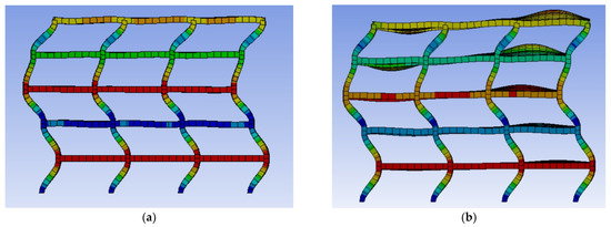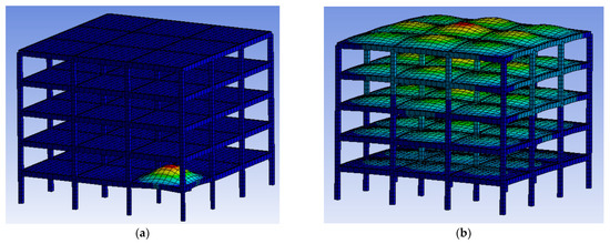 The greatest change in proper frequencies occurred in the case of the sixth axial mode. In addition, the form of this type of vibration has changed significantly (Figure 5). Displacements are concentrated in the overlapping zone for the unit damaged by fire. This could lead to the system’s responses at the impact of the vertical component of the seismic load.