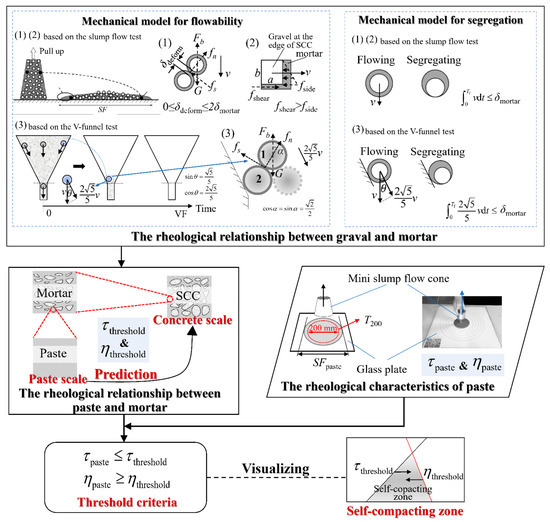 Based on the threshold criteria, the flowability of SCC can be predicted. Thus, the mix proportion satisfying self-compacting performance requirements is obtained. To discover the trend clearly and intuitively, the visualized self-compacting zone is proposed, which will be introduced in Section 2.2.