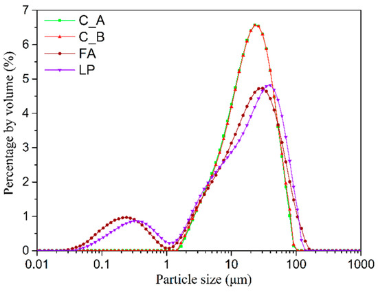 Two types of 42.5 Portland cement (marked as C_A and C_B), fly ash (FA), and limestone powder (LP) were selected as powder materials. The densities of those powders were measured with a pycnometer [34], which were 3.08, 3.15, 2.50, and 2.50 g/cm3, respectively. The particle size parameter D50 of the above four powders are 20.30, 20.39, 17.82, and 19.28 μm, while the particle distribution parameters Span are 2.26, 2.27, 3.54, and 3.46 μm. The particle size distribution curves of the powders are shown in Figure 3.
