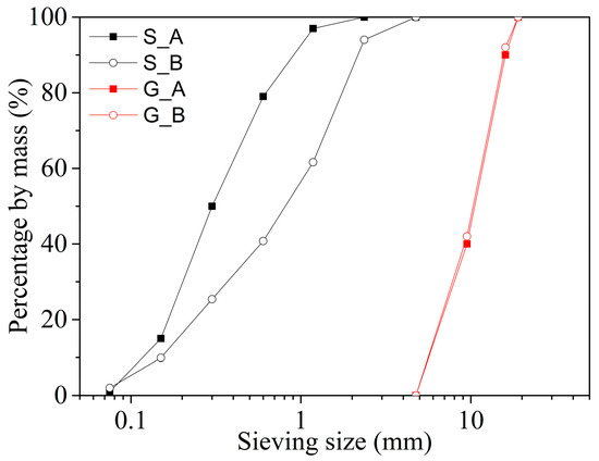 Two kinds of crushed limestone gravel were used, marked as G_A and G_B. The densities of G_A and G_B are 2.70 g/cm3 and 2.80 g/cm3, respectively. The packing densities of the above two gravels are 1.36 g/cm3 and 1.47 g/cm3. There are two types of sand. The quartz sand is marked as S_A, with a density of 2.64 g/cm3. The machine-made sand is marked as S_B, with a density of 2.65 g/cm3. Figure 4 shows the particle size distribution curves of aggregates obtained by the sieving tests. The properties of the aggregates were all tested according to Chinese standard JGJ/52 2006 [35]. A polycarboxylate-based superplasticizer (SP) was used.