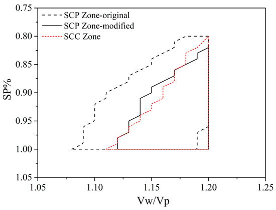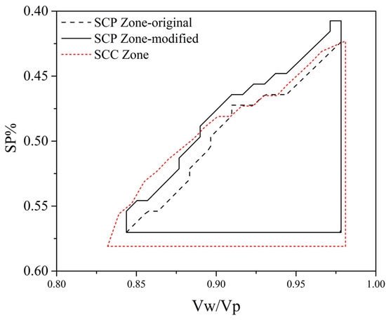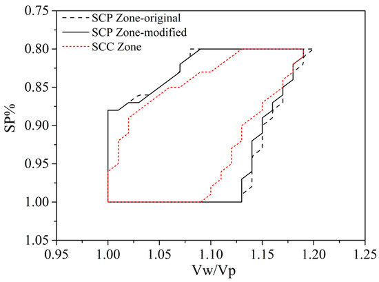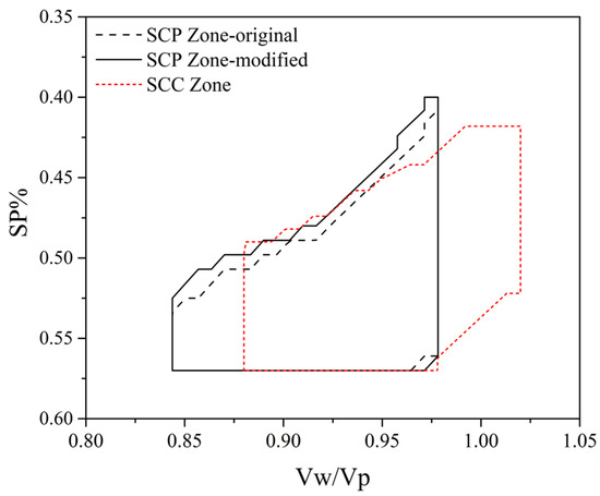 In Figure 5, the original SCP zone is to the left of the SCC zone, showing excessive prediction. Its left boundaries are distant from the SCC zone. Thus, the original method has a higher chance of obtaining a lower Vw/Vp, which leads to lower flowability. The modified SCP zone has similar boundaries to the SCC zone, almost the same. It indicates that there is a much higher probability of obtaining SCCs with good workability through the modified SCP zone.