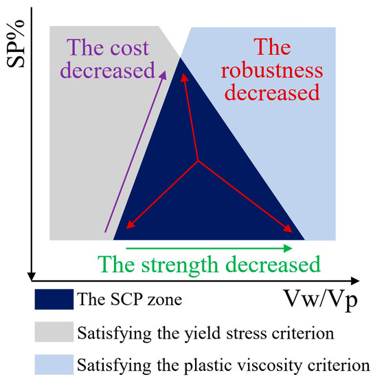 The SCP zone can help the mix design in many aspects, conducive to the achievement of the mix with satisfying performance, compressive strength, and cost. The evaluation trends are shown in Figure 11.