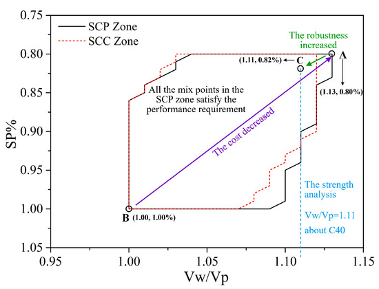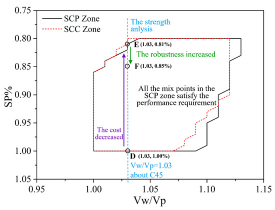For the mix design targeting performance, the SCP zone indicates all the mix points satisfying the performance requirement. The cost and robustness can be analyzed first, then the compressive strength can be evaluated by Vw/Vp.
