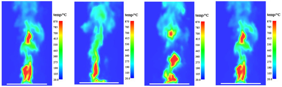 The temperature field of the flame under different wind speeds is shown in Figure 11. Observing Figure 11, it can be seen that with the increase in wind speed, there is an inclination angle of the flame when it has been in a stable state. In addition, the distribution of temperature is tilted with the inclination of the flame; the wind can change the temperature distribution of the flame area and will also change the temperature distribution of the deck area so that the high-temperature distribution of the deck is mainly concentrated in the area downwind.