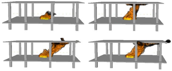 Figure 8, Figure 9 and Figure 10 depict the flame shapes under different wind speeds. The flame shapes are obtained through the software Smokeview. Under the action of each single wind speed, the four instantaneous shapes of the fire development process have been selected and compared at the moment of 2 s and 10 s, and 100 s and 400 s during the fire development process. It can be found from Figure 8, Figure 9 and Figure 10 that the flame will tilt; the greater the wind speed, the greater the tilt angle of the flame. When the wind blows, the flame is subjected to the wind force Wf along the wind direction, as the flame has buoyancy F at the same time, so the combined action of the two forces causes the flame to tilt. It can also be found that the fire spreads quickly, reaching a prosperous period of fire development at 10 s, which shows that the burning speed of a pool fire is very quick. Thus, at the beginning of the fire, personnel should be evacuated without delay. When the fuel is leaking while it is burning, the burning area will become larger and significant heat will be released. As the flame spreading direction is unknown, it can also cause more damage, especially in the vicinity of the oil pool which hasn’t burnt up. Once the fire spreads, it is more difficult to keep the fire under control. It will cause inestimable damage to the surrounding equipment and buildings.