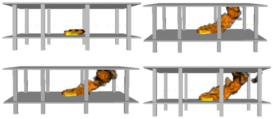 where ρ is density (in kg/m3); is velocity vector, m/s; p is pressure, Pa; h is total enthalpy, J/kg; T is temperature, K; Yi is the mass concentration of component i; Di is the diffusion coefficient of component i, m2/s; Wi is the chemical reaction rate of component i, kg/(m3 s); Mi is the molecular weight of component i, kg/mol; R is the molar gas constant, J/(mol. K); is fire heat radiation, W/m2; q is the combustion reaction heat, J/mol; k is the thermal conductivity, W/(m·K); g is the gravity acceleration, m/s2; t is the simulation time, s; is the viscous stress tensor, Pa. The contribution of those existing equations and numerical procedures comes from the commercial software FDS, the same as in Section 4.1.